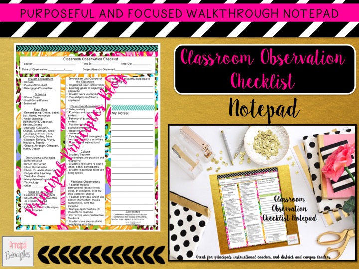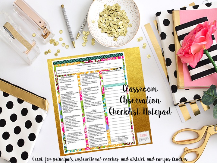 Classroom Observations: Purposeful and Focused Walkthrough notepads are now available. Let’s talk for a minute about classroom observations. The teachers do not like them. They dread them. I have had a new teacher need her asthma inhaler just because I opened the door to her room. Others are totally fine with be observed. Then we have some who are “okay” with it but rather not know in advance. Whatever the case is, I totally understand their pain and respect their feelings. However, as administrators we are required to do classroom observations. I just wish I had thought of this notepad idea years ago. So here we are now…Classroom Observation Checklist Notepad. Can I say I’m super proud of it?